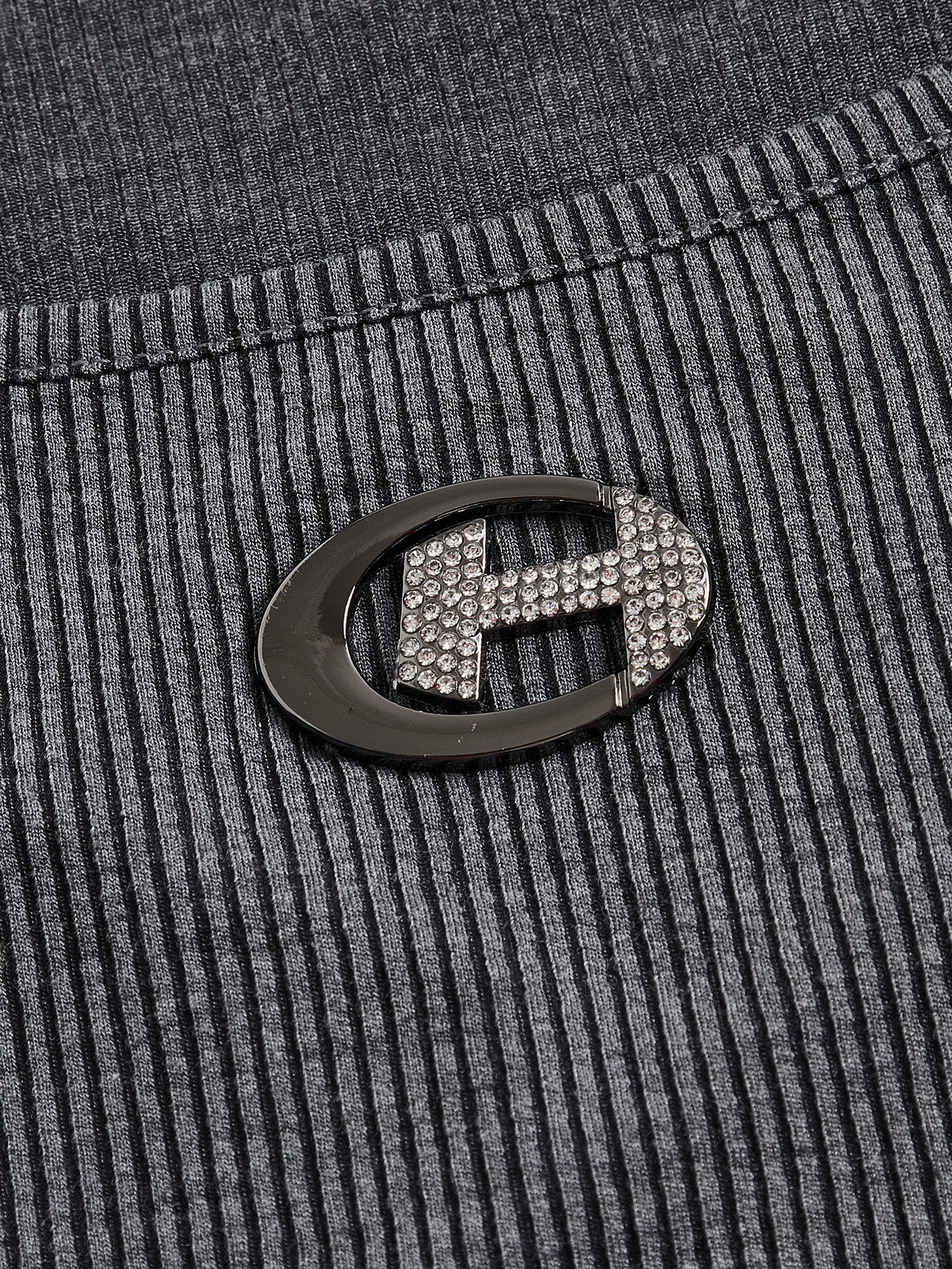 Crop T-Shirt with Rhinestones, Metal Decor, U-Neck, Asymmetrical Hem