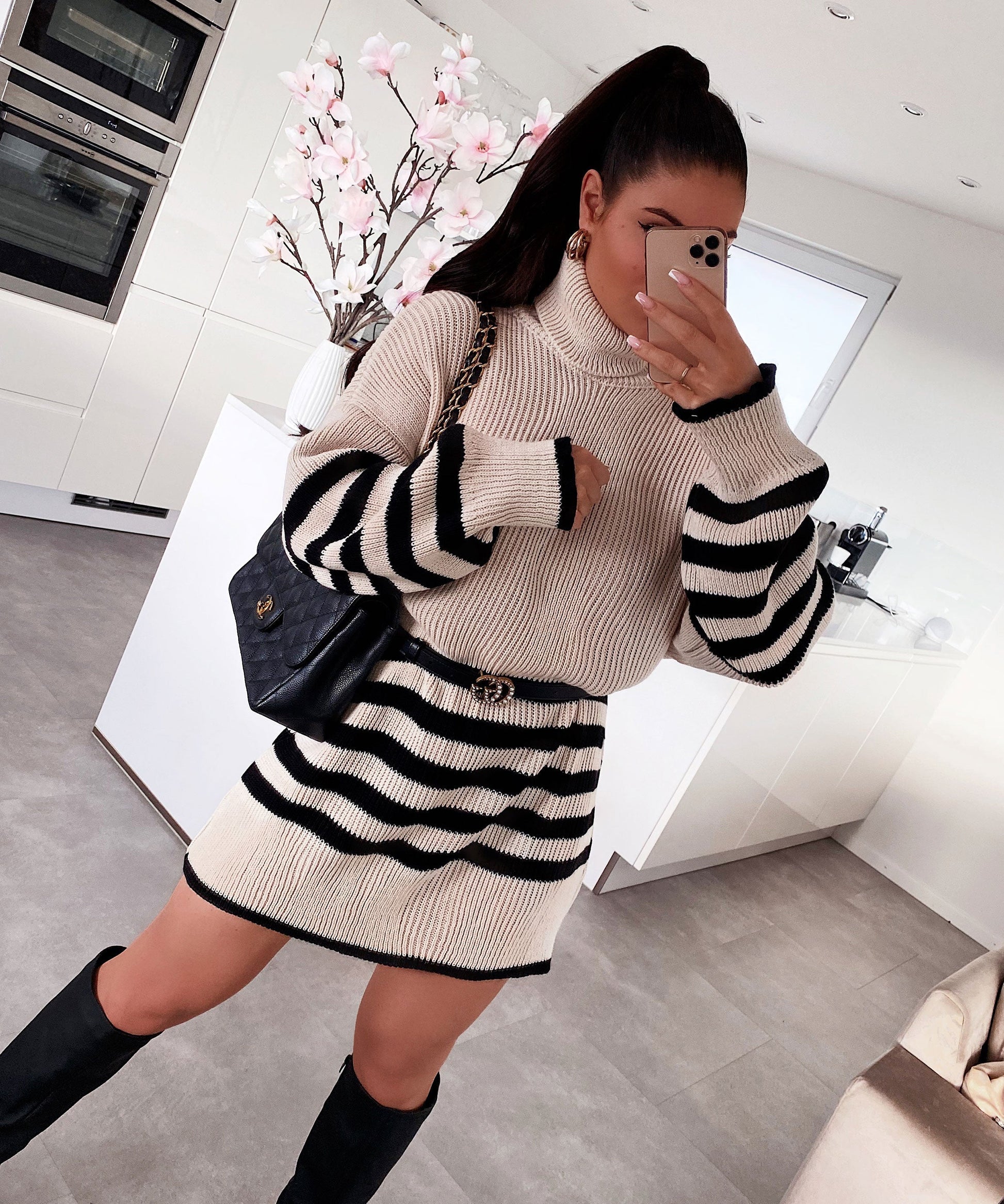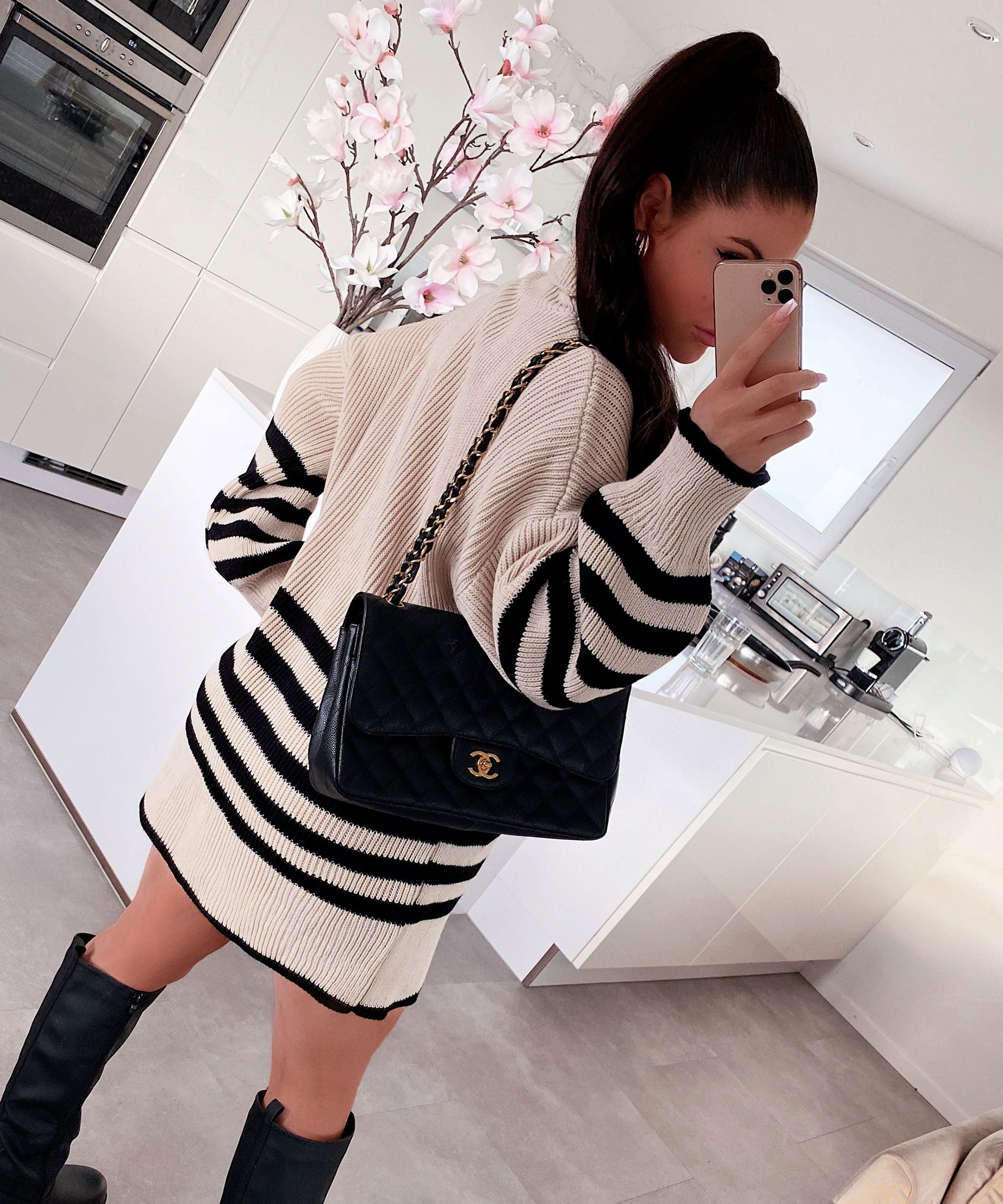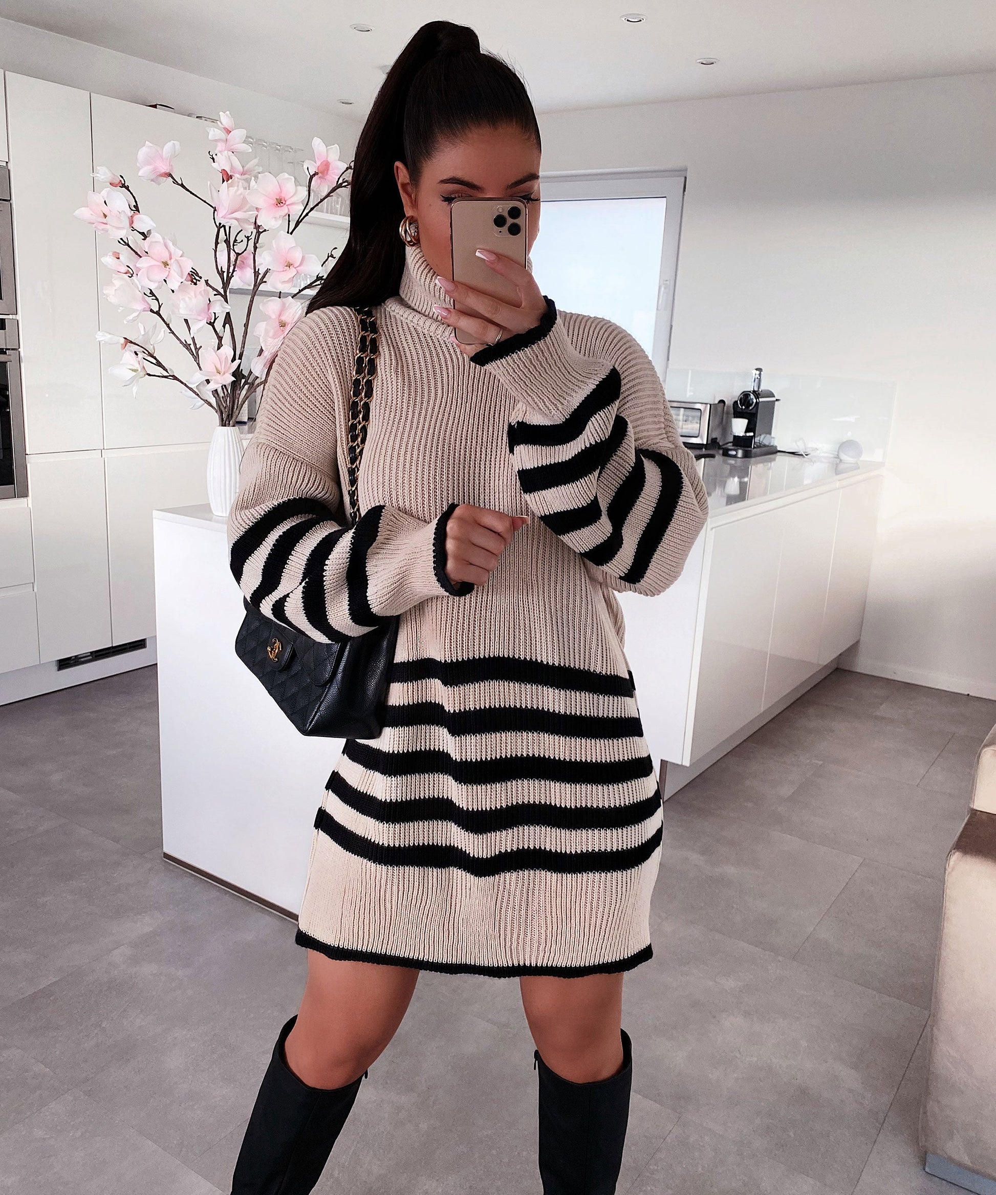 Einheitsgröße passt XS-L. Model ist 1.65m groß. Weiches Strickkleid mit Rollkragen.