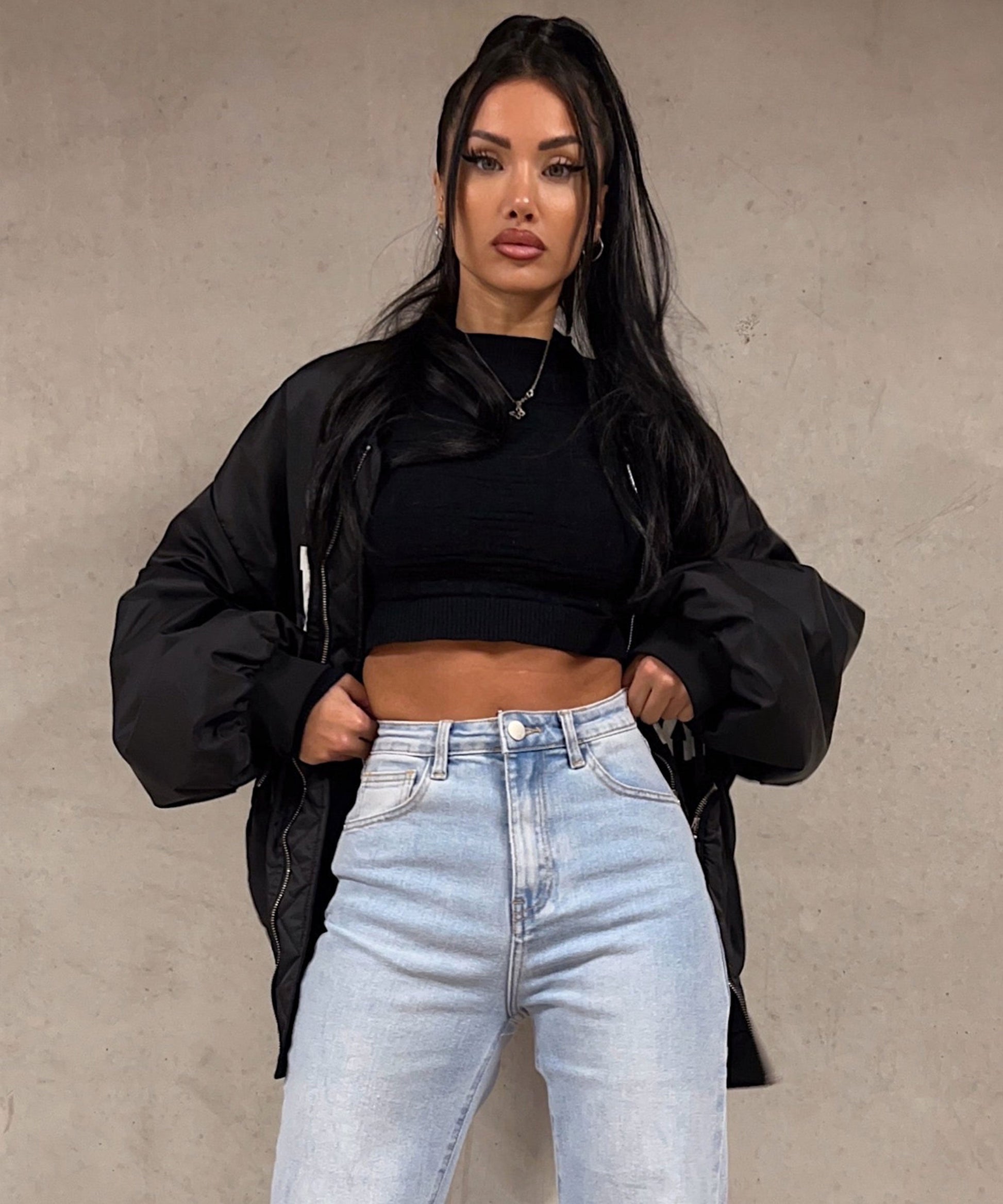 Super comfortable wide leg jeans with stretch. The pants fit true to size. Our model is 1.65m tall and wears size S.